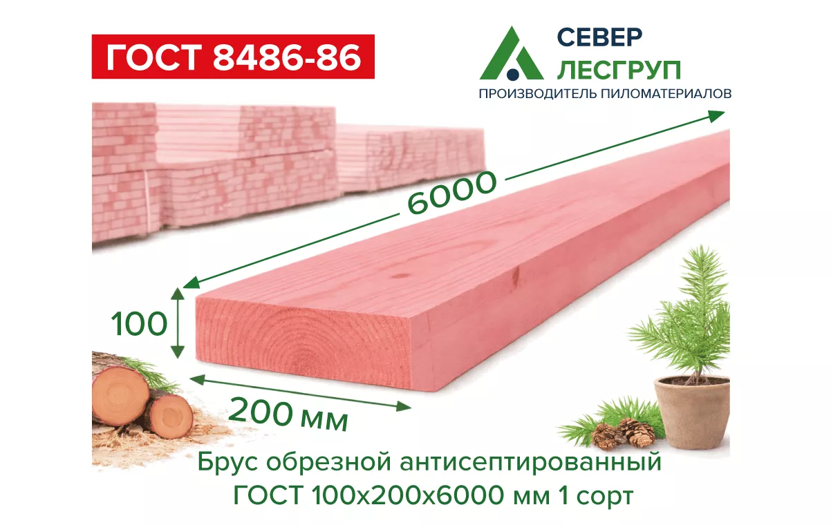 Брус обрезной антисептированный ГОСТ 100x200x6000, 1 сорт. Усиленное сечение для лаг, балок и перекрытий, когда важны прочность, геометрия и защитная обработка древесины в условиях риска увлажнения.