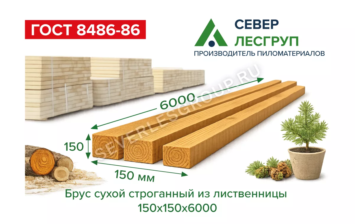 Сухой строганый брус из лиственницы 150x150x6000 и 140x140x6000, 1 сорт. Массивное сечение из плотной древесины для несущих стен, стоек и силовых каркасных конструкций с повышенной нагрузкой.