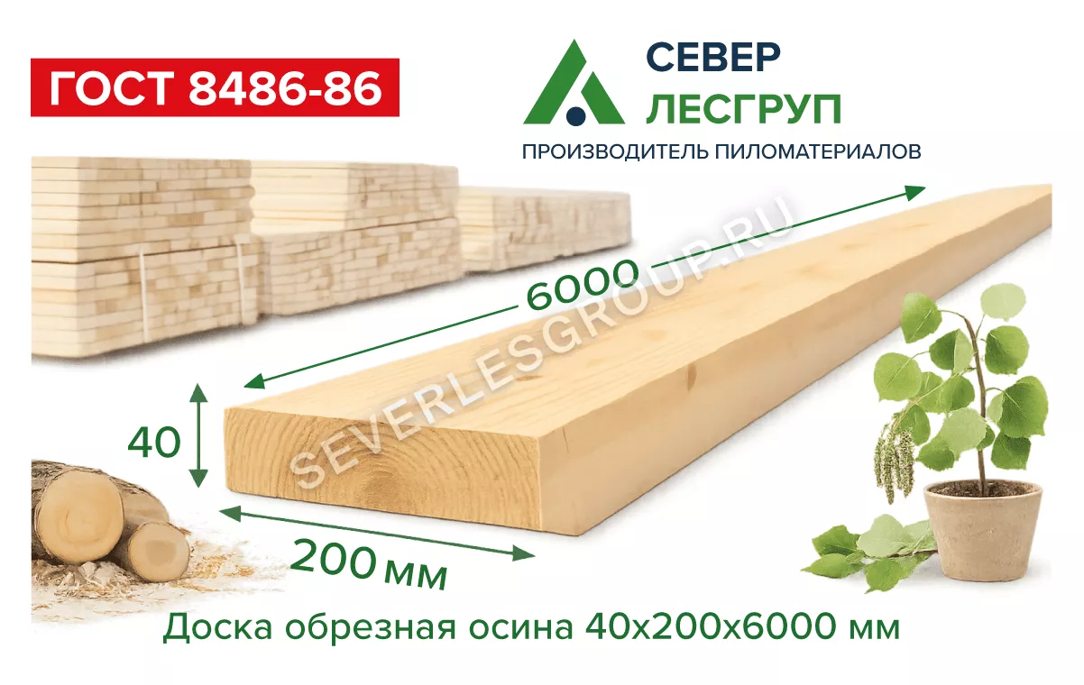 Доска обрезная осина 40х200х6000, 2 сорт, естественная влажность. Широкая и прочная доска для черновых работ и конструкций, где важны геометрия, стабильность и удобство монтажа.