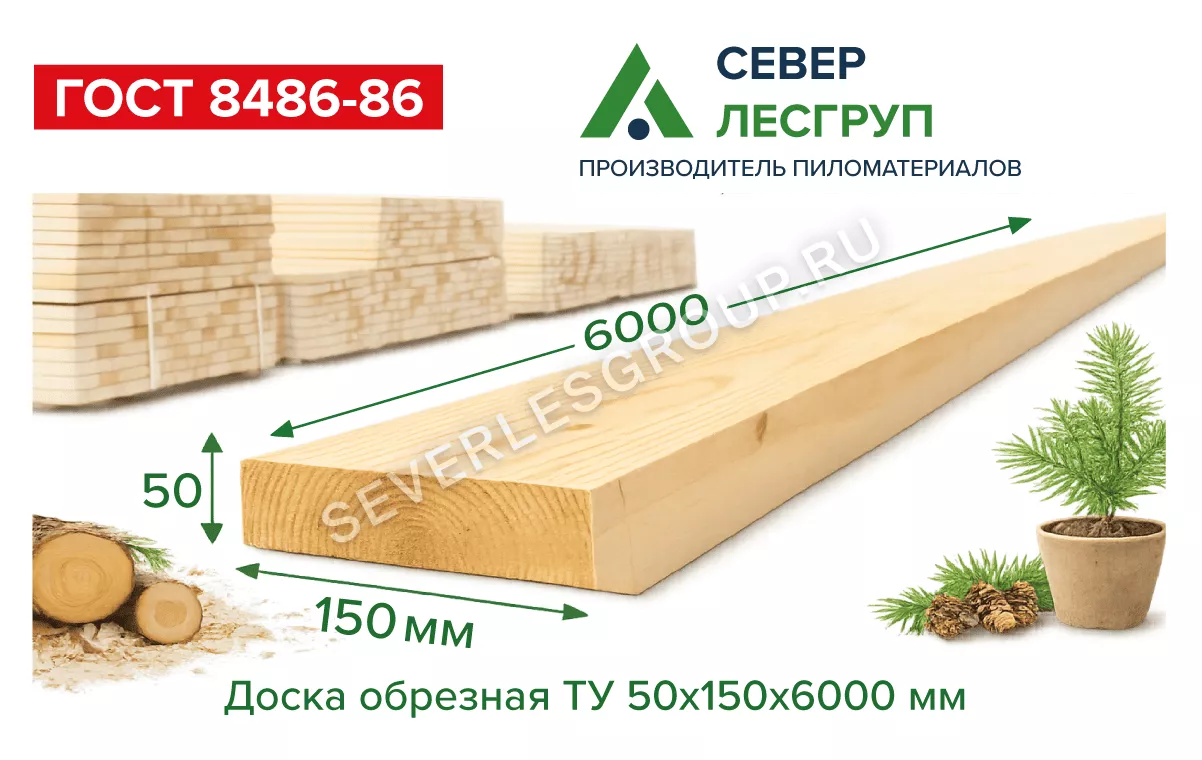 Доска обрезная ТУ 50x150x6000 и 45x140x6000, хвойные породы, естественная влажность. Рабочий пиломатериал для каркасных и черновых конструкций, где важны прочность, жесткость и рациональная стоимость.